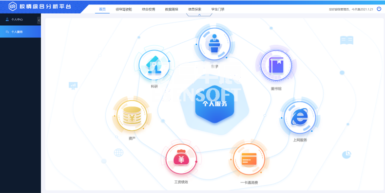 個(gè)人服務(wù)以多維度來分析和展現(xiàn)個(gè)人的各項(xiàng)工作和生活數(shù)據(jù),包括教學(xué)、圖書館、上網(wǎng)服務(wù)、一卡通消費(fèi)、工資績效、資產(chǎn)和科研等模塊,通過下鉆可以查看對(duì)應(yīng)模塊的詳細(xì)情況。如下圖: