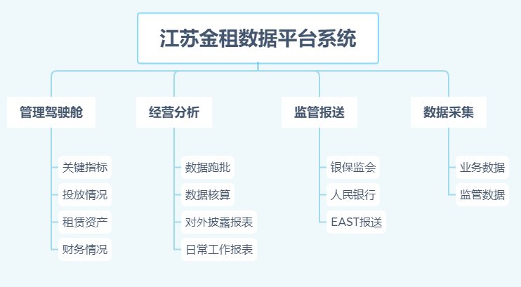 江蘇金租數(shù)據(jù)平臺(tái)系統(tǒng)目前開(kāi)發(fā)完成的主要是管理駕駛艙、經(jīng)營(yíng)分析、監(jiān)管報(bào)送、數(shù)據(jù)采集四大模塊。系統(tǒng)業(yè)務(wù)功能架構(gòu)見(jiàn)下圖: