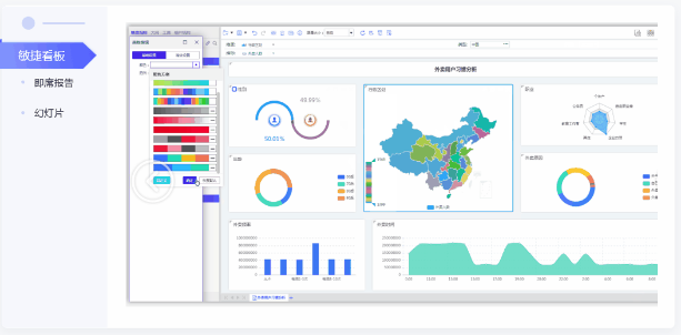 隨著互聯(lián)網(wǎng)思維的深化,如市場、財(cái)務(wù)、銷售、運(yùn)營等越來越多的崗位,都開始重視并自發(fā)性的開始了解并學(xué)習(xí)數(shù)據(jù)分析,來引導(dǎo)幫助決策。真正的數(shù)據(jù)分析,應(yīng)該完全面向業(yè)務(wù),響應(yīng)業(yè)務(wù)人員各種腦洞大開的思路,任由其隨心所欲探索數(shù)據(jù)價(jià)值。例如,運(yùn)營制定用戶活躍度模型,監(jiān)控用戶的成長以及復(fù)購和轉(zhuǎn)化,以至精細(xì)化營銷;人力資源制定效能儀表盤,去實(shí)時(shí)掌握人員狀況和人均效能,通過對(duì)招聘漏斗的分析促進(jìn)招聘效果提升。 一、什么是數(shù)據(jù)看板? 數(shù)據(jù)看板允許用戶與數(shù)據(jù)進(jìn)行交互,使他們能夠做出數(shù)據(jù)驅(qū)動(dòng)的業(yè)務(wù)決策。同時(shí),可以用來追蹤、分析、監(jiān)控和直觀展示關(guān)鍵業(yè)務(wù)指標(biāo),是公司數(shù)據(jù)驅(qū)動(dòng)的重要工具。公司通過看板監(jiān)測核心數(shù)據(jù)、及時(shí)洞察業(yè)務(wù)問題、溝通各部門落地解決方案成為常態(tài)。 二、數(shù)據(jù)BI看板的優(yōu)勢 1、敏捷決策 數(shù)據(jù)BI看板只需點(diǎn)擊幾下鼠標(biāo),就可以從不同的視角查看數(shù)據(jù)。放大、縮小、篩選要素、選擇時(shí)間間隔、顯示或隱藏不需要的特定參數(shù)。能夠以前所未有的方式查看數(shù)據(jù),幫助決策者使用企業(yè)最新的數(shù)據(jù)來做分析。 2、實(shí)時(shí)監(jiān)控 業(yè)務(wù)發(fā)展速度對(duì)于任何想要在殘酷的數(shù)字時(shí)代生存下去的公司來說,是至關(guān)重要的因素。使用傳統(tǒng)的Excel或PPT時(shí),數(shù)據(jù)每更新一次都必須要手動(dòng)更新報(bào)告。而商業(yè)智能的核心在于,數(shù)據(jù)BI看板可以支持實(shí)時(shí)數(shù)據(jù)。 3、提高效率 隨著互聯(lián)網(wǎng)發(fā)展速度越來越快,收集并需要分析的數(shù)據(jù)量在不斷增長。雖然靜態(tài)報(bào)告已成為可靠的工作助手,但使用Excel的處理大量數(shù)據(jù)依舊顯得很吃力。而使用數(shù)據(jù)BI看板,不僅可以更迅速地處理數(shù)據(jù),還能提高生產(chǎn)力。 4、節(jié)省資源 因?yàn)閷?duì)數(shù)據(jù)庫查詢或自定義的需求數(shù)量大大減少,不僅IT部門能夠?qū)W⒂谄渌o迫或有價(jià)值的任務(wù),而業(yè)務(wù)人員也可以快速獲得問題的答案。讓用戶自主執(zhí)行數(shù)據(jù)分析,可以幫助公司節(jié)省寶貴的IT資源。 三、如何搭建數(shù)據(jù)BI看板 本文給大家介紹一款國內(nèi)簡單又好用的數(shù)據(jù)分析產(chǎn)品-億信ABI。它億信華辰自主研發(fā)的一站式數(shù)據(jù)分析平臺(tái)。它提供了從數(shù)據(jù)導(dǎo)入、數(shù)據(jù)預(yù)處理、自動(dòng)建模和數(shù)據(jù)可視化分析于一體的完整的解決方案。業(yè)務(wù)人員可以僅僅通過拖拽幾下鼠標(biāo)便完成基本數(shù)據(jù)查詢到數(shù)據(jù)可視化的流程。 靈活的數(shù)據(jù)預(yù)處理 對(duì)于接入系統(tǒng)的數(shù)據(jù),通過點(diǎn)選式的方式進(jìn)行去除重復(fù)行、空值替換、數(shù)據(jù)裁剪、數(shù)據(jù)脫敏、類型轉(zhuǎn)換等復(fù)雜的數(shù)據(jù)處理操作,并且能進(jìn)行圖形化界面多表關(guān)聯(lián)。 百億數(shù)據(jù)秒級(jí)響應(yīng) 支持基于列存儲(chǔ)的MPP架構(gòu)的分布式數(shù)據(jù)庫進(jìn)行敏捷分析,百億數(shù)據(jù)可達(dá)到秒級(jí)響應(yīng),給用戶帶來極致的產(chǎn)品體驗(yàn),可解決TB甚至PB級(jí)超大數(shù)據(jù)量敏捷分析的難題。 豐富的可視化展示 支持敏捷看板,即席報(bào)告,幻燈片等多種分析方式,使數(shù)據(jù)分析更貼近用戶應(yīng)用的場景。并且提供多種可視化組件:表格、常規(guī)統(tǒng)計(jì)圖、html5統(tǒng)計(jì)圖、地圖等。 分分鐘制作敏捷看板 支持靈活的自由式布局、組件化的統(tǒng)計(jì)圖、豐富的數(shù)據(jù)統(tǒng)計(jì)函數(shù)、靈活的篩選功能、智能的圖表聯(lián)動(dòng),用戶只需通過簡單的拖拉拽,就可以快速地制作出一張敏捷看板。