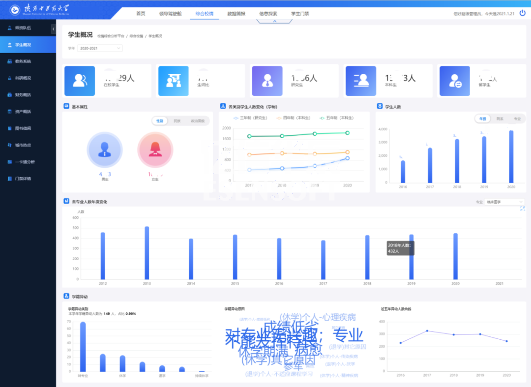 陜西中醫(yī)藥大學(xué)是一所以中醫(yī)藥專業(yè)為主體,醫(yī)、理、工、文、管多學(xué)科專業(yè)相互支撐、交叉融合的醫(yī)科類院校。其數(shù)字化工作一直走在高校前列,近年來啟動(dòng)智慧校園建設(shè)。但一直以來數(shù)據(jù)缺乏良好的展示平臺(tái),陜西中醫(yī)藥大學(xué)選擇與聯(lián)奕合作,利用數(shù)據(jù)分析軟件億信ABI有效打通信息收集和展示的鏈路,構(gòu)建一個(gè)可視化、自動(dòng)化的數(shù)據(jù)管理平臺(tái)。 那么,就具體的場景而言,一站式數(shù)據(jù)分析平臺(tái)億信ABI是怎么發(fā)揮作用的呢? 為什么需要數(shù)據(jù)化運(yùn)營 高校信息化的建設(shè)與發(fā)展不斷更新迭代,已形成了“人、財(cái)、物”為管理對(duì)象的各種業(yè)務(wù)管理系統(tǒng),也因此積累了海量的業(yè)務(wù)數(shù)據(jù)。但傳統(tǒng)的各業(yè)務(wù)系統(tǒng)建設(shè)或多或少都有各自的數(shù)據(jù)分析與展示后臺(tái),由于系統(tǒng)之間的壁壘,數(shù)據(jù)無法實(shí)時(shí)共享,導(dǎo)致數(shù)據(jù)的分析展示作用、查看權(quán)限受限。 智慧校園場景化落地實(shí)戰(zhàn) 陜西中醫(yī)藥大學(xué)利用億信ABI建設(shè)了統(tǒng)一的校情綜合分析平臺(tái),涉及內(nèi)容包括首頁、領(lǐng)導(dǎo)駕駛艙、綜合校情、數(shù)據(jù)簡報(bào)、信息探索和學(xué)生門禁等各項(xiàng)內(nèi)容。通過數(shù)據(jù)化運(yùn)營改進(jìn)數(shù)據(jù)收集和管理方式,用數(shù)據(jù)驅(qū)動(dòng)業(yè)務(wù),對(duì)業(yè)務(wù)數(shù)據(jù)進(jìn)行可視化分析,以提升學(xué)校管理水平和服務(wù)能力。 輕松整合異構(gòu)數(shù)據(jù)源 傳統(tǒng)的學(xué)校教務(wù)人員如果需要做數(shù)據(jù)分析,需要操作多個(gè)不同異構(gòu)系統(tǒng),不僅涉及系統(tǒng)繁多,工作量大,而且工作內(nèi)容復(fù)雜,差錯(cuò)容忍度低。單純依靠人工操作,不僅效率多,耗費(fèi)大量人力,還易產(chǎn)生數(shù)據(jù)誤差。億信ABI可從多個(gè)系統(tǒng)、數(shù)據(jù)源獲取數(shù)據(jù),支持多種數(shù)據(jù)庫連接,還可以輕松整合多個(gè)業(yè)務(wù)系統(tǒng)的數(shù)據(jù),打破信息孤島,進(jìn)行綜合展示分析,讓決策更清晰。 領(lǐng)導(dǎo)駕駛艙運(yùn)營管理多元化 領(lǐng)導(dǎo)駕駛艙以駕駛室的方式,根據(jù)詳細(xì)的評(píng)價(jià)指標(biāo)體系,將收集的數(shù)據(jù)信息根據(jù)各種各樣普遍的數(shù)據(jù)圖表(3D地圖、柱狀圖、折線圖、餅狀圖)藝術(shù)化、形象化、細(xì)化,即時(shí)體現(xiàn)學(xué)校運(yùn)作的重要指標(biāo)值,形象化的檢測學(xué)校運(yùn)行狀態(tài),供學(xué)校領(lǐng)導(dǎo)層按時(shí)匯報(bào)工作。