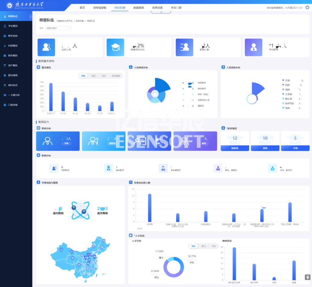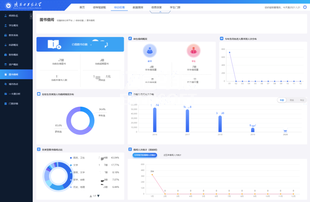 豐富的校情可視化數(shù)據(jù)看板 在綜合校情查詢與主題分析角度,對(duì)教務(wù)教學(xué)、科研、資產(chǎn)、財(cái)務(wù)、人事與學(xué)生管理、一卡通等業(yè)務(wù),進(jìn)行結(jié)構(gòu)、趨勢(shì)、分布等綜合分析,讓各級(jí)領(lǐng)導(dǎo)一屏在手,掌握全局,多種指標(biāo)實(shí)時(shí)隨地呈現(xiàn),助力科學(xué)決策。 師資隊(duì)伍 高校師資隊(duì)伍建設(shè)的優(yōu)劣決定了高校人才培養(yǎng)質(zhì)量的高低。如何在大數(shù)據(jù)時(shí)代科學(xué)利用源于高校各個(gè)層面的海量數(shù)據(jù),并使之成為高校師資隊(duì)伍建設(shè)的參考與方向,是眾多高校需要解決的問題。師資隊(duì)伍頁面通過展現(xiàn)教職工主要的屬性指標(biāo),分析了目前高校師資隊(duì)伍建設(shè)中所存在的問題,對(duì)加強(qiáng)高校師資隊(duì)伍建設(shè)起到指導(dǎo)作用。如下圖: 學(xué)生概括 學(xué)生概括展現(xiàn)出學(xué)生的基本屬性、人數(shù)分布、學(xué)籍情況、借閱與消費(fèi)、畢業(yè)與就業(yè)等指標(biāo)。如下圖: 資產(chǎn)分析 強(qiáng)化資產(chǎn)管理是推進(jìn)預(yù)算制度改革的重要內(nèi)容,也是部門預(yù)算有效執(zhí)行的重要保證。資產(chǎn)概括頁面通過分析學(xué)校各類型資產(chǎn)的存量和分布情況,可以提高資產(chǎn)的利用率,從而指導(dǎo)探索進(jìn)一步管好用好高校資產(chǎn)的方法與途徑。如下圖: 圖書借閱 對(duì)陜西中醫(yī)藥大學(xué)圖書館館藏圖書的種數(shù)、冊(cè)數(shù),以及圖書借閱率,不同用戶群借閱情況進(jìn)行了統(tǒng)計(jì),通過對(duì)統(tǒng)計(jì)數(shù)據(jù)的分析找出了圖書流通的一般規(guī)律,為今后館藏資源的配置、布局以及流通閱覽服務(wù)工作的完善提供參考。如下圖: 一卡通分析 一卡通分析頁面通過對(duì)全校師生消費(fèi)和卡片進(jìn)行分析,可以讓學(xué)校管理者對(duì)在校師生的消費(fèi)情況和規(guī)律有一個(gè)量化的認(rèn)識(shí),從而能夠合理地分配資源,降低管理成本,這對(duì)校園的規(guī)劃建設(shè)和學(xué)校學(xué)生管理工作都具有重要的作用。如下圖: 多層級(jí)的權(quán)限管理 億信ABI搭建的校情綜合分析平臺(tái),系統(tǒng)主要分五種類型用戶:學(xué)校領(lǐng)導(dǎo)、行政部門領(lǐng)導(dǎo)、教學(xué)部門領(lǐng)導(dǎo)、行政部門老師和教學(xué)部門老師。用戶根據(jù)不同的角色具有不同的權(quán)限 ,看到的信息也不同。