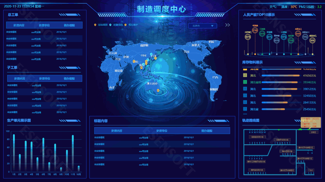 —TOP 4— 制度調(diào)度大屏 最佳分辨率:1920*1080 使用場景:工業(yè)4.0時代,制造業(yè)也開始積極響應(yīng)產(chǎn)業(yè)數(shù)字化的號召,融合大數(shù)據(jù)分析、3D地圖等技術(shù),構(gòu)建體系先進、功能強大、場景豐富的制造調(diào)度指揮系統(tǒng),滿足了生產(chǎn)調(diào)度、應(yīng)急指揮、遠程指揮、綜合決策以及企業(yè)宣傳等多種應(yīng)用場合。 展現(xiàn)邏輯:通過世界地圖一覽在建及歷史項目的運轉(zhuǎn)狀態(tài),方便售后維護;另外對于制造中心內(nèi)的總工單、子工單、物料消耗、人員產(chǎn)能等指標(biāo)進行充分直觀地展現(xiàn)。