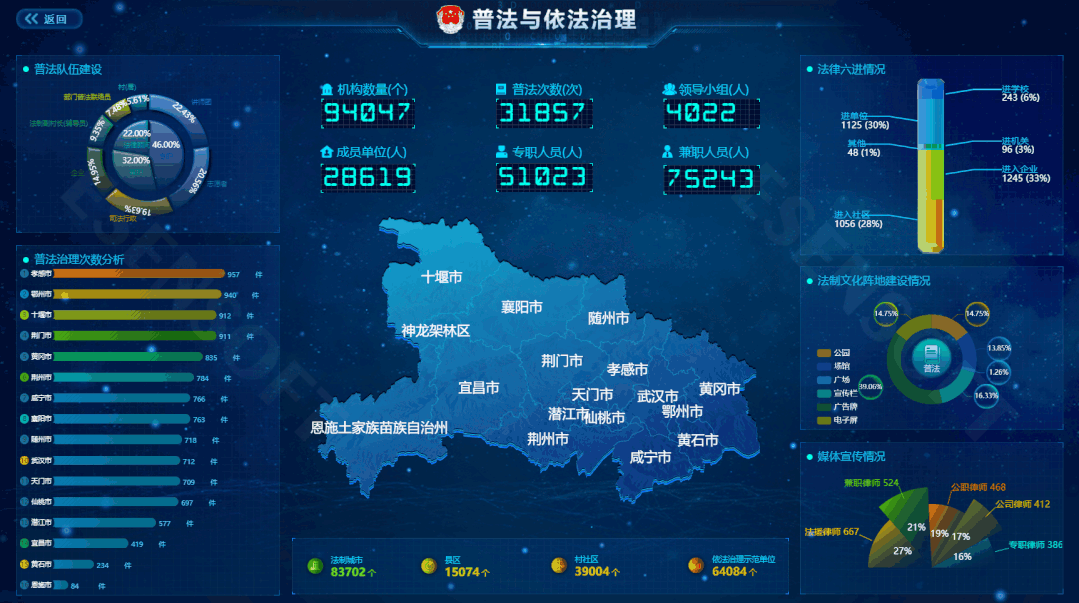 —TOP 2— 法制宣傳大屏 最佳分辨率:1920*1080 使用場景:了解普法工作的推進情況,包括隊伍建設(shè)、媒體宣傳、各個縣市的大數(shù)據(jù)對比等,對于有法制宣傳,法律服務(wù)等需求的行業(yè)提供大屏承載方案,助其成為暢通社情民意、服務(wù)保障民生的監(jiān)管新陣地。 展現(xiàn)邏輯:使用樣式各異的圖表,展示法律行業(yè)內(nèi)的不同需求的數(shù)據(jù),根據(jù)地理位置等信息數(shù)據(jù),直觀、便捷的展現(xiàn)數(shù)據(jù)結(jié)果,讓人一目了然。 —TOP 3— 數(shù)據(jù)共享大屏 最佳分辨率:4800*1620 使用場景:將數(shù)據(jù)集中到數(shù)據(jù)共享平臺,實現(xiàn)多數(shù)據(jù)源管理,透明化的服務(wù)支持,使得數(shù)據(jù)資源可觀、可感、可控,智能化的提出數(shù)據(jù)共享側(cè)的建議。最終,加強決策和預(yù)測能力從而提升公司整體數(shù)據(jù)管理水平。 展現(xiàn)邏輯:實時展示數(shù)據(jù)資產(chǎn)申請情況、元數(shù)據(jù)情況、數(shù)據(jù)質(zhì)檢情況、數(shù)據(jù)安全、執(zhí)行情況等信息,并添加大量的動畫效果使其充滿科幻感。